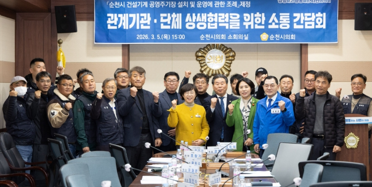 이날 간담회에는 강형구 의장과 이복남·정홍준 의원을 비롯해 순천시 교통관리과, 건설기계연협회 관계자 등 50여 명이 참석해 공영주기장 설치 필요성에 대해 의견을 나눴다.