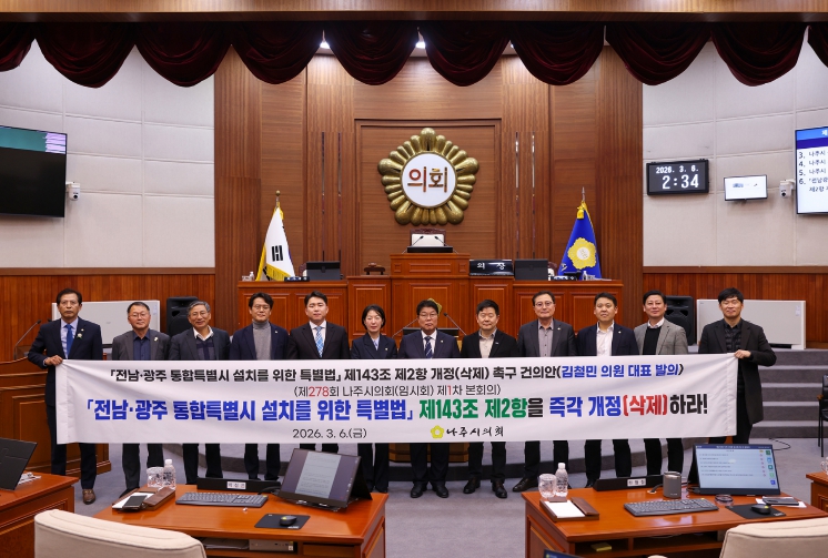[한국뉴스1-박시현 기자]나주시의회는 3월 6일 제278회 임시회 제1차 본회의를 열고 ''전남광주통합특별시 설치를 위한 특별법' 제143조 제2항 삭제 촉구 건의안'을 채택했다.