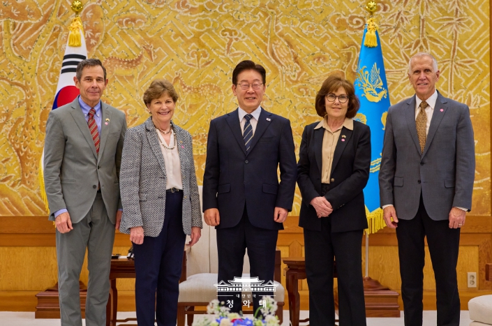 [한국뉴스1-박시현 기자]이재명 대통령은 4월 2일 오후 청와대에서 진 섀힌(Jeanne Shaheen) 상원 외교위원회 간사 등 공화·민주 양당 의원으로 구성된 미국 상원의원 대표단을 접견했다. 이 대통령과 미 대표단은 한미동맹 및 한반도 문제를 비롯해 중동 전쟁의 안보적·경제적 파장과 대응 방안에 대해 심도 있는 의견을 교환하고, 향후 경제적 여파 대응 과정에서 한미가 긴밀히 소통해 나가는 것이 중요하다는 점에 뜻을 같이 했다.