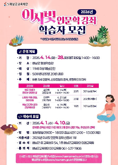 [한국뉴스1-박시현 기자]해남군교육재단은 4월 14일부터 28일까지‘해남 이사빛 인문학 강좌’를 운영한다.‘이사빛’은‘이른 아침 따스하게 비추는 햇빛’을 의미하며 따뜻하고 친근한 인문학의 빛을 전하는 군민 교육과정이다.